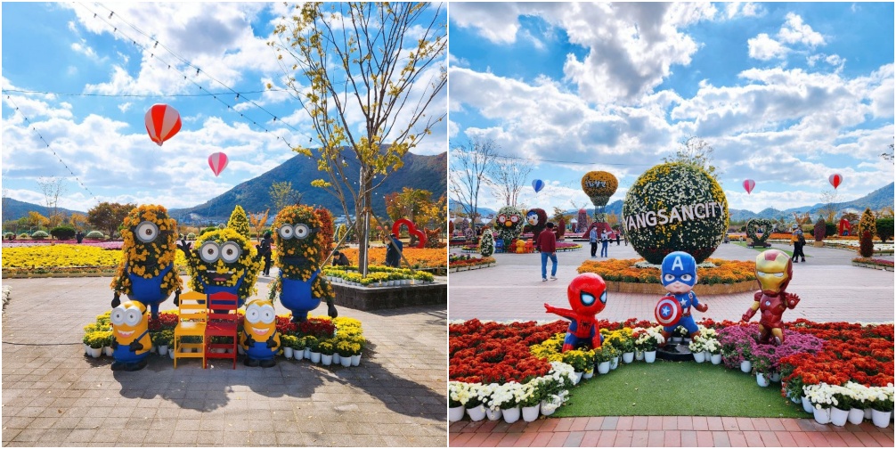 커다란 타워 옆으로는 아기자기한 캐리터 조형물들이 꽃단장을 하고 기다리고 있었습니다. 아이들이 좋아하는 뽀로로 캐릭터와 미니언즈 캐릭터가 국화꽃 옷을 입고 있습니다. 어른들도 좋아하지만 아이들과 같이 구경온 사람들이 아이들 사진찍기에 바쁜곳이었습니다.